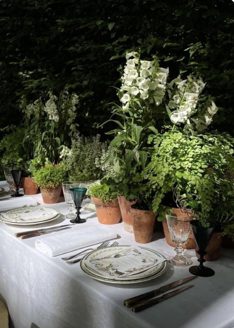 Beyond the table, outdoor spaces take on a life of their own, with ceramic pots brimming with season herbs and greenery. It’s this interplay between table and surroundings that creates the feeling of relaxed, familiar, lived in.