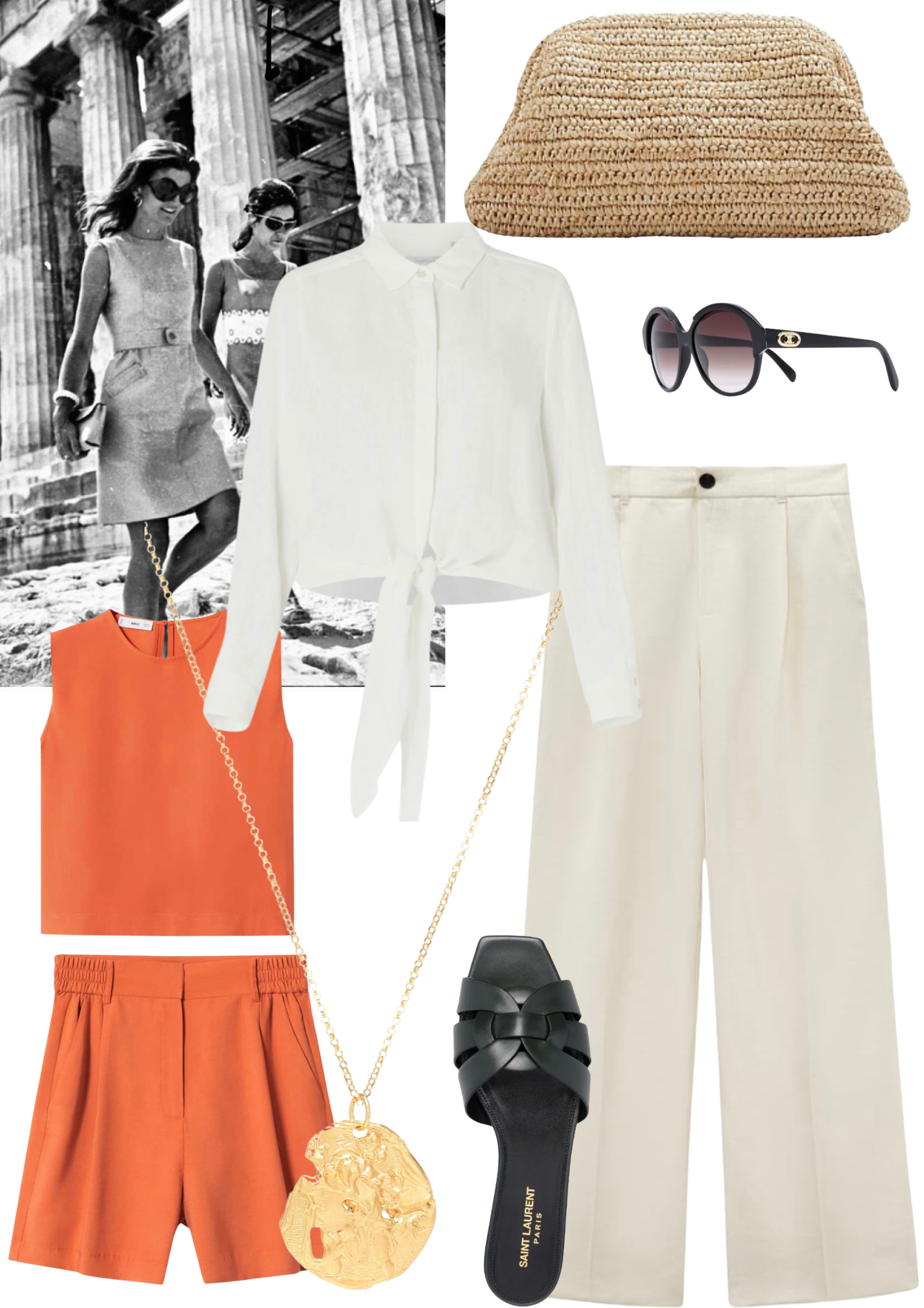 Coral Red Flowy Top & Shorts./ Full Length Trousers ./ Linen Shirt ./ Raffia Clutch ./ Celine Sunglasses ./ Flat Sandal ./ Necklace ./